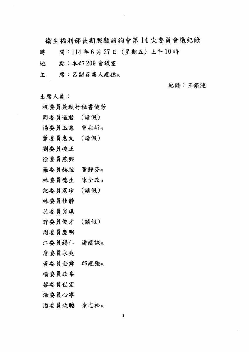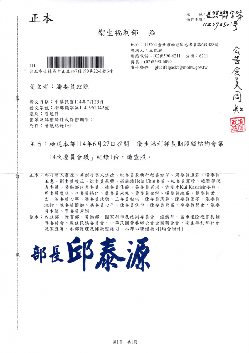 長照聯字第114072501號衛福部長照諮詢會第14次委員會議紀錄