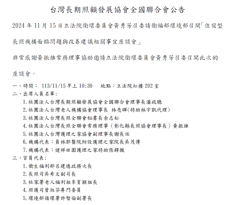住宿型長照機構面臨問題與改善建議相關事宜座談會